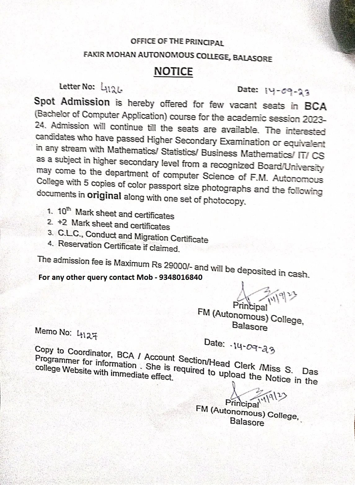 | BCA Spot Admission- 2023 | 14-09-23 |